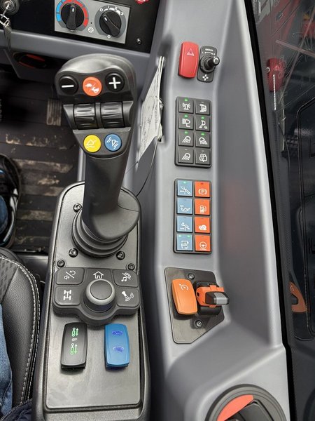 Drugi element to tempomat. Tu różnica wobec samochodu polega na tym, że tempomat działa nie tylko w przejeździe transportowym, ale także w pracy. Operator może ustawić prędkość roboczą np. na 3 km/h i utrzymać jednostajny posuw przy podgarnianiu kiszonki, wybieraniu obornika czy zamiataniu, a następnie – korzystając z ręcznej regulacji obrotów silnika w kabinie – chwilowo podnieść moc osprzętu (np. łyżki), bez zmiany prędkości jazdy. W praktyce odciąża to ręce operatora i pozwala skupić się na precyzji manewru, nie na pilnowaniu pedału gazu.