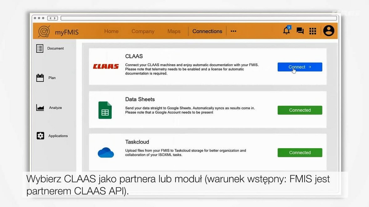 Platforma Claas Telematics synchronizuje linie graniczne działek z programem FMIS i automatycznie przesyła wszystkie prace wykonane przez maszyny oraz dane o wydajności i plonie. Klient może się od tego momentu zająć przetwarzaniem tych danych w programie i nie musi już poświęcać czasu na ich przenoszenie ani na tworzenie kolejnych linii granicznych w kilku systemach.