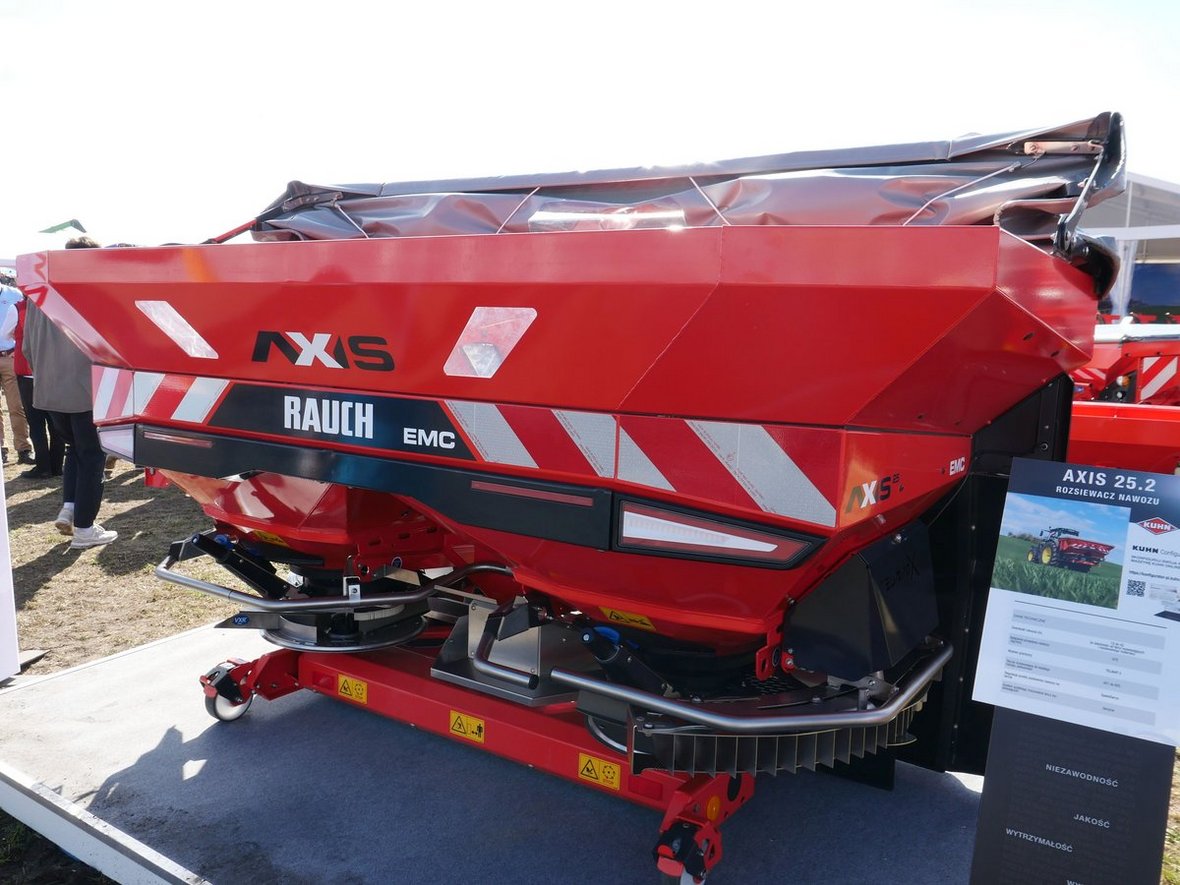 Skoro mowa o rozsiewaczach, po raz pierwszy w Polsce zaprezentowano model Axis 25.2. Maszyna mieści się między modelami Axis 20 i 30, ma pojemność zbiornika od 1500 do 3000 l i ładowność 2500 kg. Szerokość robocza wynosi od 12 do 50 m, z osobną tarczą do azotu zapewniającą precyzyjny wysiew na 30 m. – Ten rozsiewacz jest w stanie precyzyjnie dozować nawóz nawet przy dużych szerokościach roboczych. Jego wydajność wynosi 670 kg na minutę – podkreślił Szymczak. Maszyna została całkowicie przebudowana: zmieniono dno, układ przeniesienia, sterowanie i tarczę wysiewającą. Dostępne są dwie wersje napędu: podstawowa i EMC z hydraulicznym napędem.