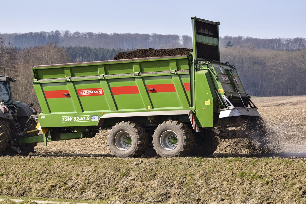 Napęd bijaków rozrzucających przenoszony jest za pomocą wałków kardana. W porównaniu ze zwykłym napędem łańcuchowym wyróżnia się znacznie płynniejszą pracą i minimalnym zużyciem przez co wymagana konserwacja została zredukowana do minimum.Podczas targów, Bergmann zaprezentował również system automatycznego, elektronicznego monitorowania ogranicznika wzorca rozrzutu. Gdy ogranicznik rozrzutu zostanie ustawiony w pozycji roboczej, jest to rozpoznawane elektronicznie, a prędkość rozrzutu dostosowywana jest automatycznie do nowej szerokości roboczej. Dzięki temu dawka wysiewu pozostaje stała nawet przy zmniejszonej szerokości roboczej. Dotąd regulacja taka mogła być wykonywana tylko ręcznie przez kierowcę za pomocą terminala obsługowego. Rozrzutnik TSW 6240 W jest standardowo wyposażony w hydrauliczne podwozie, które zapewnia maksymalny komfort jazdy zarówno na drodze jak i na polu. Opcjonalnie dostępna jest unoszona pierwsza oś pozwalająca zwiększać nacisk dyszla na zaczep. Zwiększa w ten sposób nacisk na tylną oś ciągnika i poprawia jego trakcję. Jest to szczególnie przydatna funkcja przy pustym lub częściowo napełnionym rozrzutniku, zmniejsza również zużycie opon. Opcjonalnie dostępny jest hydropneumatycznie amortyzowany dyszel dla zapewnienia jeszcze większego komfortu jazdy. Na standardowe wyposażenie rozrzutnika składa się system ważący z 8 czujnikami obciążenia oraz system automatycznego wykrywania wysokości otwarcia ściany dozującej, który umożliwia automatyczne dostosowanie prędkości przesuwania się podłogi dla zapewnienia optymalnego tempa rozrzutu. Rozrzutnik 6240 W można standardowo obsługiwać za pomocą sterownika ciągnika. Możliwe jest również stosowanie modułów sterujących (E-control light lub Pilotbox) lub terminalu sterującego Bergmann BCT 20. Opcjonalnie dostępne jest także sterowanie za pośrednictwem terminali Isobus takich jak CCI 50, CCI 200 i CCI 1200 CCI lub innych zgodnych z certyfikatem AEF.