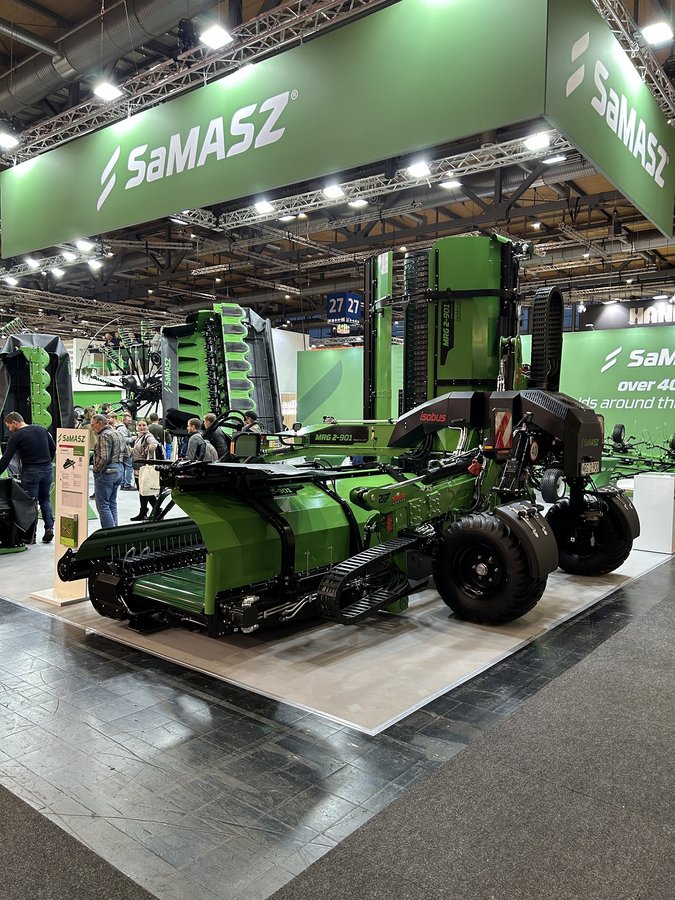 A jeśli chodzi o nowości produktowe, SaMASZ zaprezentował prototyp nowej zgrabiarki Z4-1440, zapowiadający kolejną generację maszyn o wysokiej wydajności. Maszyna ma 15 ramion na rotor o średnicy 3,8 m, aktywny układ hydropneumatycznego odciążenia i szerokość transportową 3 m bez demontażu ramion. Hermetyczne przekładnie w kąpieli olejowej, wymienne cięgła i ramiona o profilu trójkątnym zwiększają trwałość i ograniczają serwis. Sześciokołowe podwozie kopiujące z kołami skrętnymi oraz dostępne szerokie ogumienie pozwalają dopasować pracę do różnych warunków polowych. Sterowanie ISOBUS, automatyczne poziomowanie ramy oraz regulacja nakładania pokosu poprawiają komfort operatora. Rozwiązania takie jak Jet-Effect i przegubowe zawieszenie dbają o czystość zielonki i ochronę darni. Wśród nowości warto wymienić także kosiarkę dyskową KDX 350 z belką PerfectCUT, pełnymi płozami ze stali borowej oraz nakładkami Hardox, które zmniejszają zużycie i chronią belkę przed uszkodzeniami.