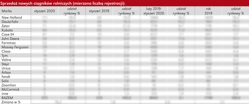 Sprzedaż ciągników rolniczych w Polsce wystrzeliła w styczniu 2020 r. Wystarczy rzut oka na dane z Centralnej Ewidencji Pojazdów i Kierowców (CEPiK) za pierwszy miesiąc br. które wskazują, iż w tym czasie klienci (rolnicy, przedsiębiorcy, samorządy lokalne itp.) zarejestrowali aż 573 szt. nowych ciągników rolniczych. Do sporych zmian doszło w czołówce notowanych marek - styczniowym liderem został New Holland, przed markami Deutz-Fahr i Zetor.