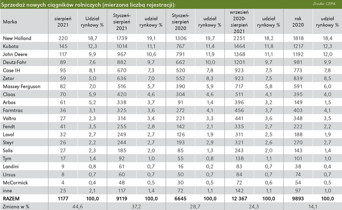 Sprzedaż ciągników rolniczych w Polsce w pierwszych ośmiu miesiącach 2021 r. wzrosła w znaczący sposób w porównaniu do stycznia-sierpnia 2020 r. I tradycyjnie już wystarczy choćby pobieżne spojrzenie na dane z Centralnej Ewidencji Pojazdów i Kierowców (CEPiK), które wskazują, iż w tym czasie klienci zarejestrowali aż 9119 szt. nowych ciągników rolniczych, z czego w sierpniu br. - aż 1177 sztuk! Wolumen rynku po styczniu-sierpniu br. jest wyższy aż o 37,2% niż w analogicznym okresie 2020 r. (6645 sztuk).